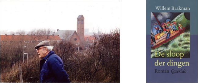 Willem Brakman tijdens een wandeling in de duinen bij Duindorp. Op de achtergrond de Prinses Julianakerk. Foto Gerrit Jan Kleinrensink 2000. Boek De sloop der dingen.