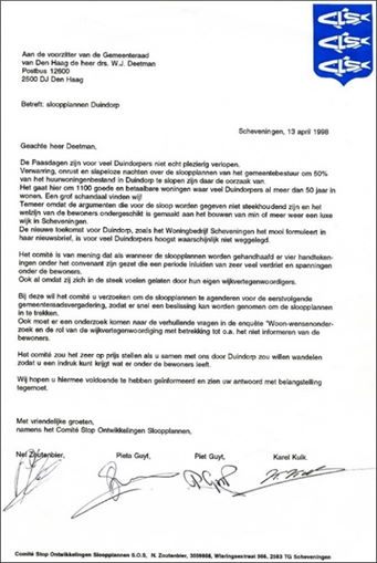 Brief SOS Duindorp aan burgemeester Deetman. 13 april 1998