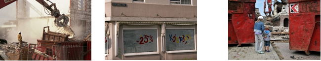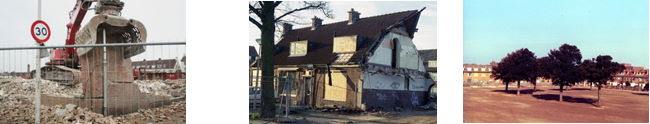 V.l.n.r. Aanvang sloop eerste woning en winkel hoek Pluvierstraat Bevelandsestraat, de textielwinkel van Arina