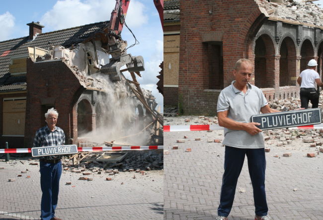 V.l.n.r. Jan Teeken en Karel Kulk met straatnaambord Pluvierhof bij de sloop van de boog. Foto Karel Kulk